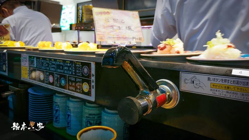座位台上有茶水杯、空盤、薑片、筷子(盒內)、醬油、哇沙比わさび和綠茶粉(煎茶),收費除了依盤子顏色來計價外,座位台也有文字型菜單可看,如果要看的是有附實物圖片的菜單,可以跟服務員索取。(大概是因為熊本一家是國外遊客的關係,所以一入席後,服務生就直接給熊本一家有實物圖片的菜單了,直接解決看不懂日文菜單的困擾。)